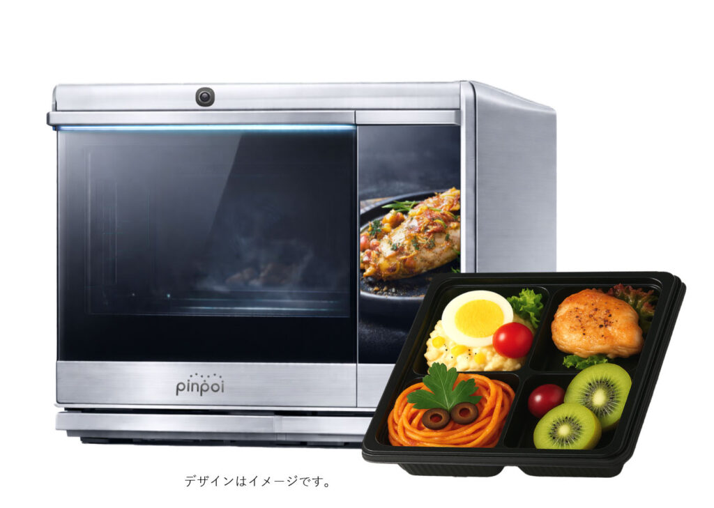 従来の電⼦レンジでは「温めるべき⾷材」と「そのままの温度を保ちたい⾷材」を同じ加熱⼯程で対応することが難しい状況です。例えば、「サラダと温かいメインディッシュが⼀緒の弁当」では、適切な温冷管理が難しく、商品ラインナップからは外れています。温冷区別加熱を実現する、「pinpoi」でお弁当のラインナップをさらに拡⼤します。